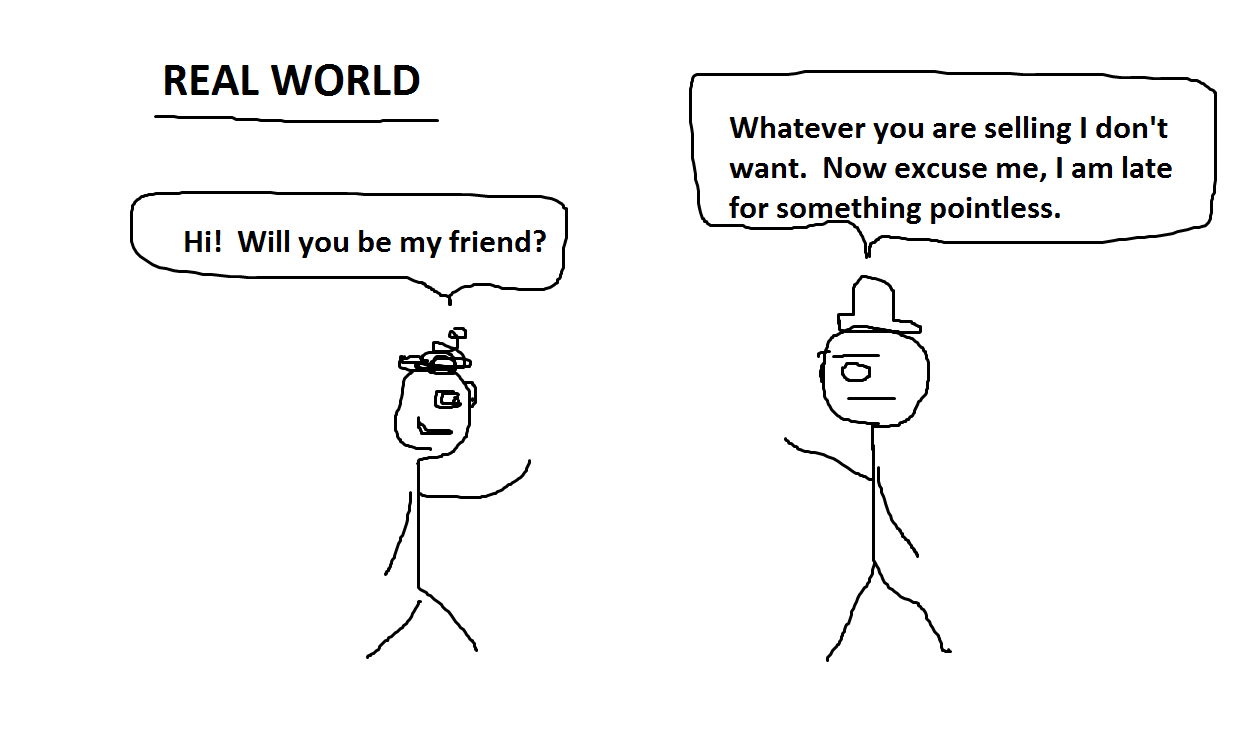 179. LOL, so funny because you are really telling the truth about our world these days, because it’s not easy to ask someone to be your friend in these days. CRAZY WORLD!!!!