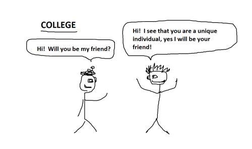• College – Places to make friends: Frats, clubs, sports, classes, study groups, gym, cafeteria, in the hallway, bathrooms, on the bus, dorms, ANYWHERE.