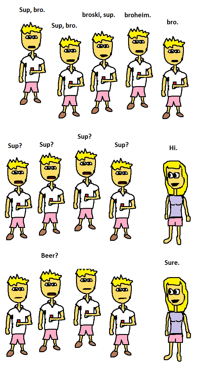 The Couples Party consists of, as the name would suggest, young couples doing things that would normally seem fun, but because everyone is more concerned with their significant other than anything else going on, any single person observing this scene would more or less be dumbfounded how anyone is having a good time. No single person could ever enjoy a Couples Party.