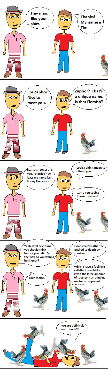 The rooster thing is a bit scary I have to say I thought what’s a rooster doin in there? oh there is another one, and another and another oh nooooo he’s going to get eaten by a bunch of roosters¿¿ Luckily he just got pecked to death….what a relief ;D